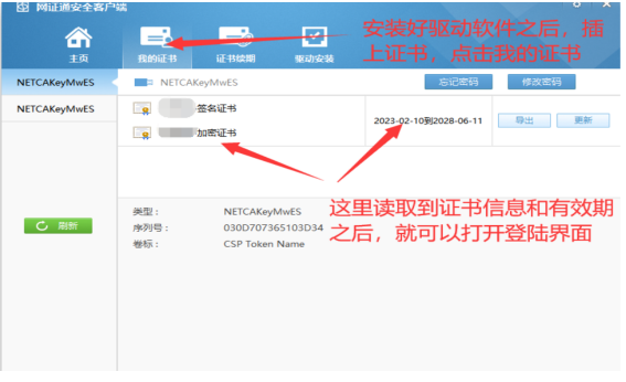 1、打开网证通安全客户端,插入网证通数字证书,点击我的证书,能读取到证书信息和